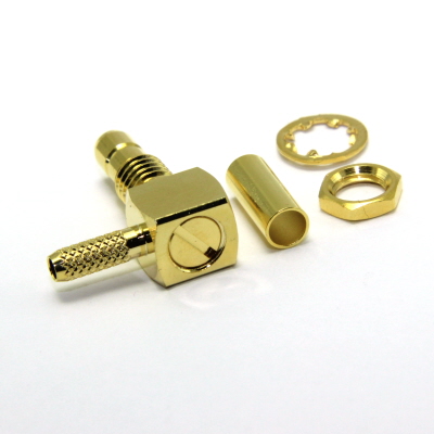 SMB 50 ohm right angle bulkhead jack. With gold plated body and contact, the centre contact is soldered and the braid crimped. Suitable for use with RG174 and similar cables in group AD.